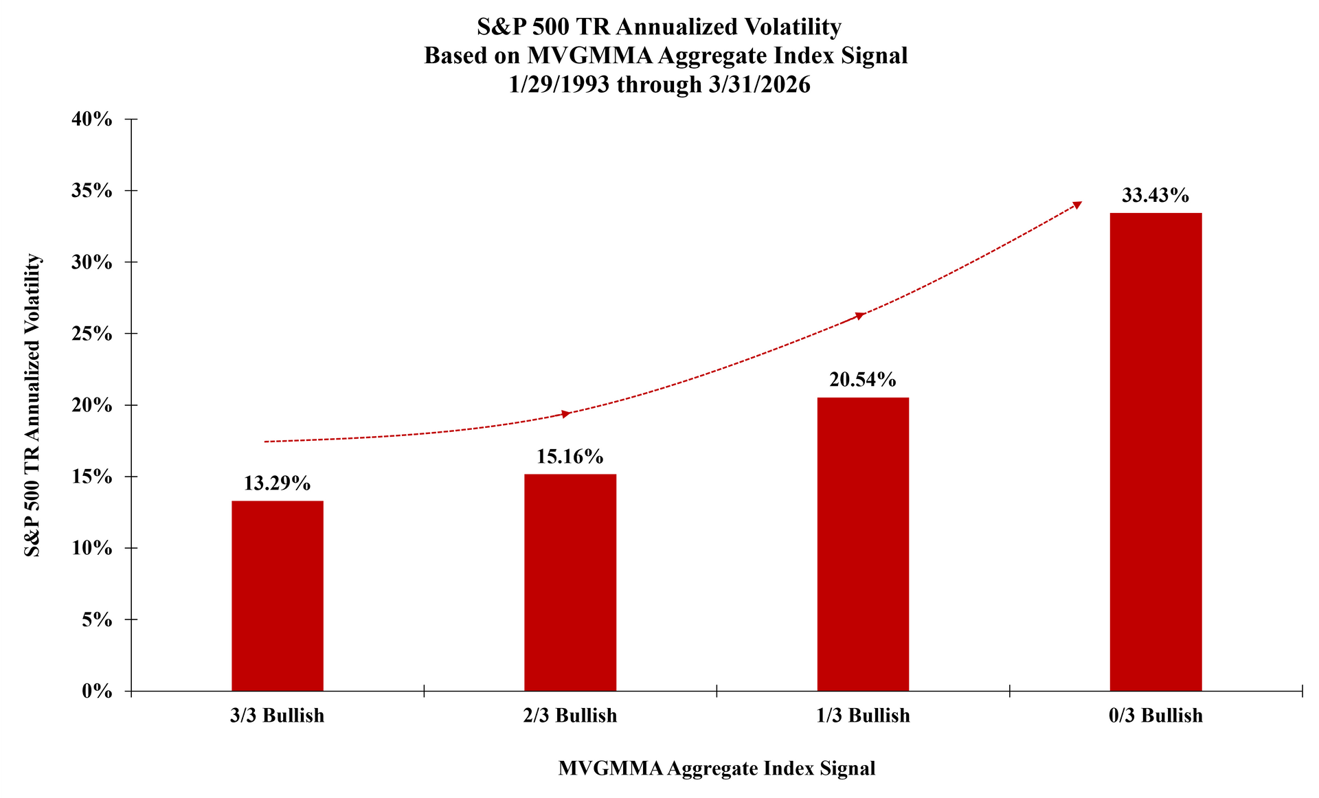 Source: GammaRoad Capital Partners, LLC. This chart depicts the annualized volatility for the S&P 500 TR Index through points in time during which the MVGMMA Aggregate Index Signal was at each of its possible levels. The MVGMMA Index launched on December 22, 2023. Prior to December 22, 2023, all data points shown herein reflect periods when the MVGMMA Index was not actually published. Past performance is not indicative of future results. Please see the important disclosures that are integral to understanding the limitations applicable to the quantitative information in the presentation.