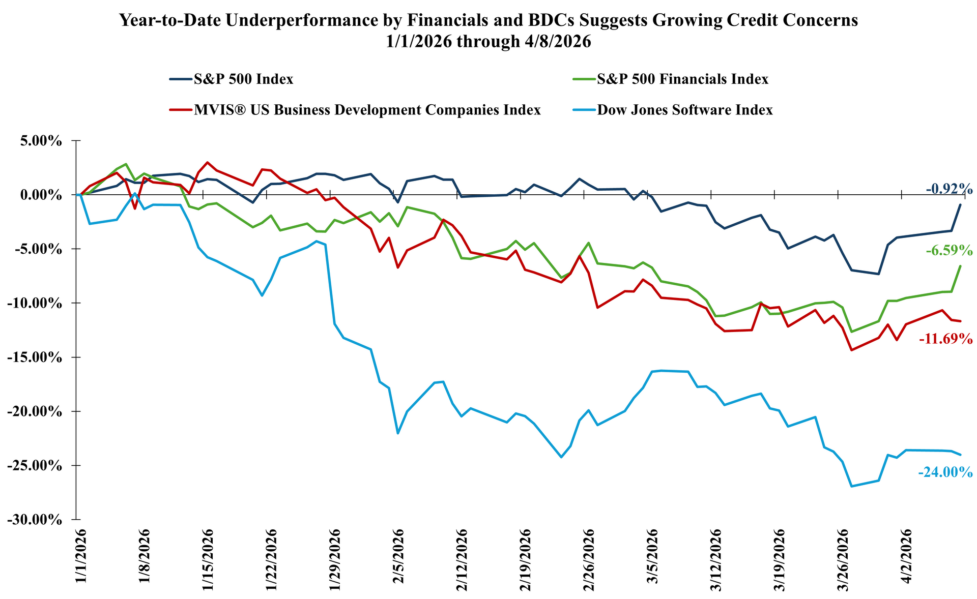 Regarding the latter two risk themes, the price weakness we noted last month for publicly listed banks, credit managers, and BDCs continued to indicate deterioration in loan books and underlying asset values through March and into early April, as shown in the chart below: