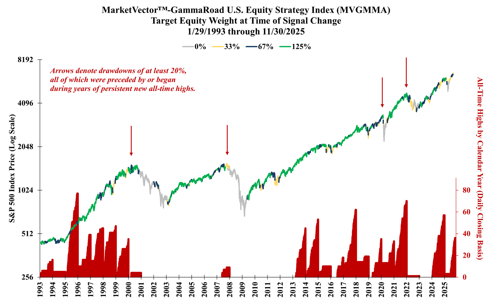 Source: GammaRoad Capital Partners, LLC. The S&P 500 Index is shown here on the y-axis to illustrate the index price level as the MarketVector™-GammaRoad U.S. Equity Strategy Index (Bloomberg: MVGMMA Index) target equity weight changes over time. The MVGMMA Index launched on December 22, 2023. Prior to December 22, 2023, the above target equity weight changes reflect backtested information based on the application of the MVGMMA Index methodology to the S&P 500 Index price data during periods when the MVGMMA Index was not actually published. Please see the important disclosures that are integral to understanding the limitations applicable to the quantitative information in the presentation.