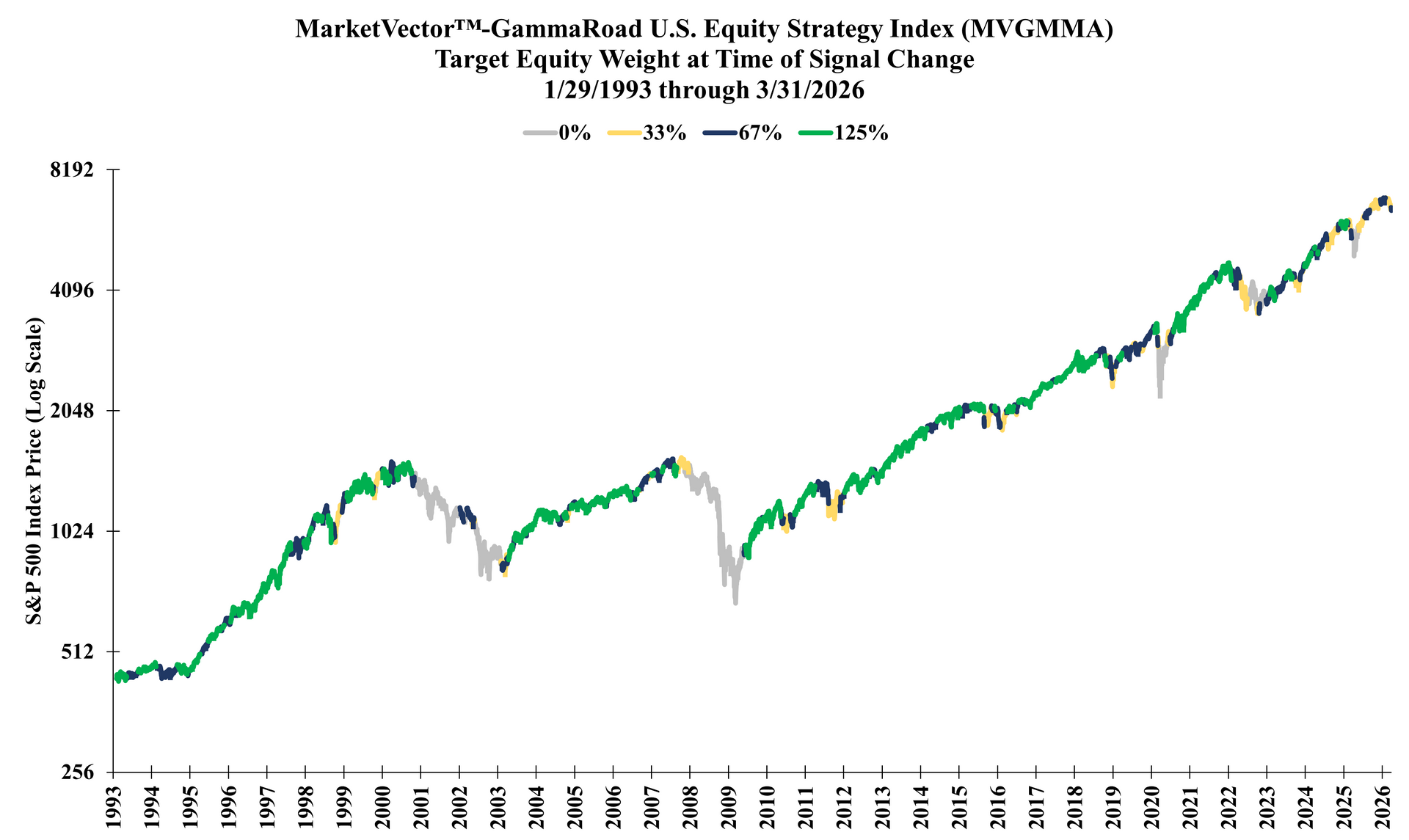 Source: GammaRoad Capital Partners, LLC. The S&P 500 Index is shown here on the y-axis to illustrate the index price level as the MarketVector™-GammaRoad U.S. Equity Strategy Index (Bloomberg: MVGMMA Index) target equity weight changes over time. The MVGMMA Index launched on December 22, 2023. Prior to December 22, 2023, the above target equity weight changes reflect backtested information based on the application of the MVGMMA Index methodology to the S&P 500 Index price data during periods when the MVGMMA Index was not actually published. Please see the important disclosures that are integral to understanding the limitations applicable to the quantitative information in the presentation.