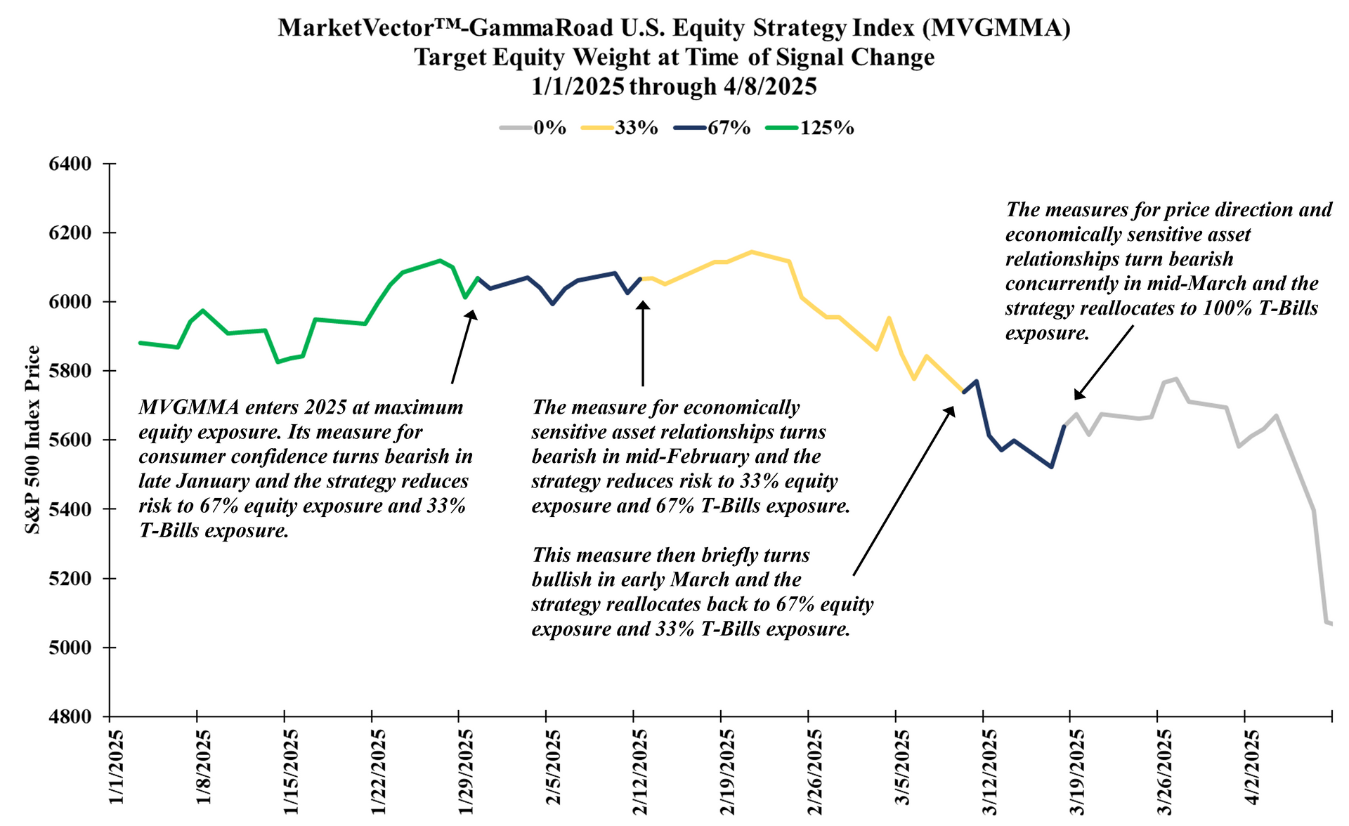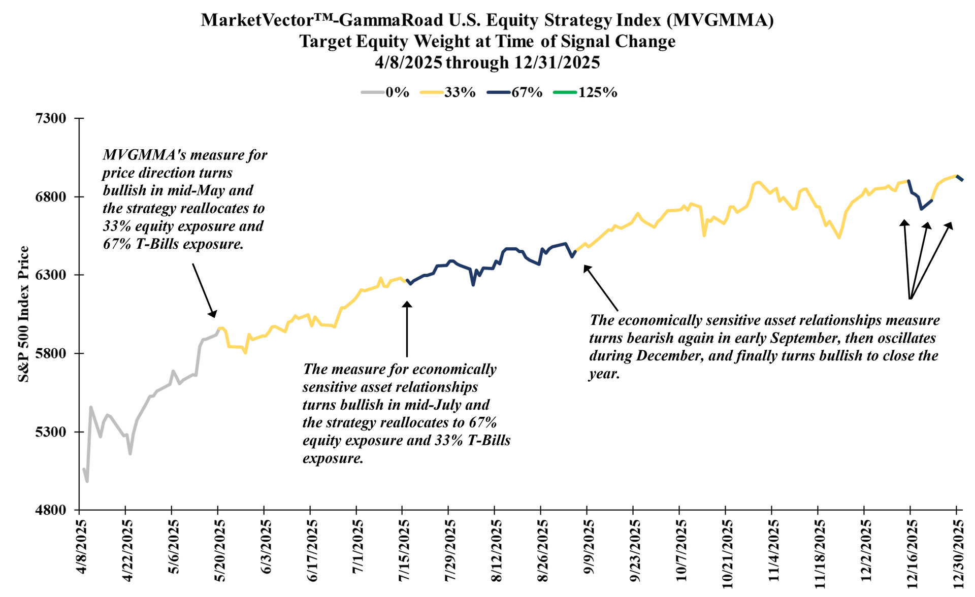 Source: GammaRoad Capital Partners, LLC. The S&P 500 Index is shown here on the y-axis to illustrate the index price level as the MarketVector™-GammaRoad U.S. Equity Strategy Index (Bloomberg: MVGMMA Index) target equity weight changes over time. The MVGMMA Index launched on December 22, 2023. Please see the important disclosures that are integral to understanding the limitations applicable to the quantitative information in the presentation.
