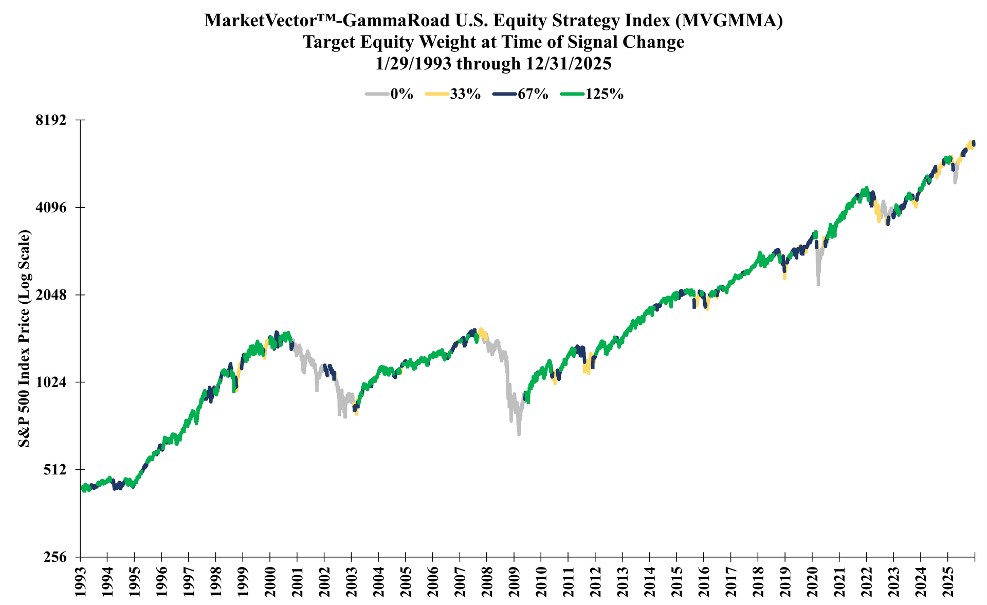 Source: GammaRoad Capital Partners, LLC. The S&P 500 Index is shown here on the y-axis to illustrate the index price level as the MarketVector™-GammaRoad U.S. Equity Strategy Index (Bloomberg: MVGMMA Index) target equity weight changes over time. The MVGMMA Index launched on December 22, 2023. Prior to December 22, 2023, the above target equity weight changes reflect backtested information based on the application of the MVGMMA Index methodology to the S&P 500 Index price data during periods when the MVGMMA Index was not actually published.
